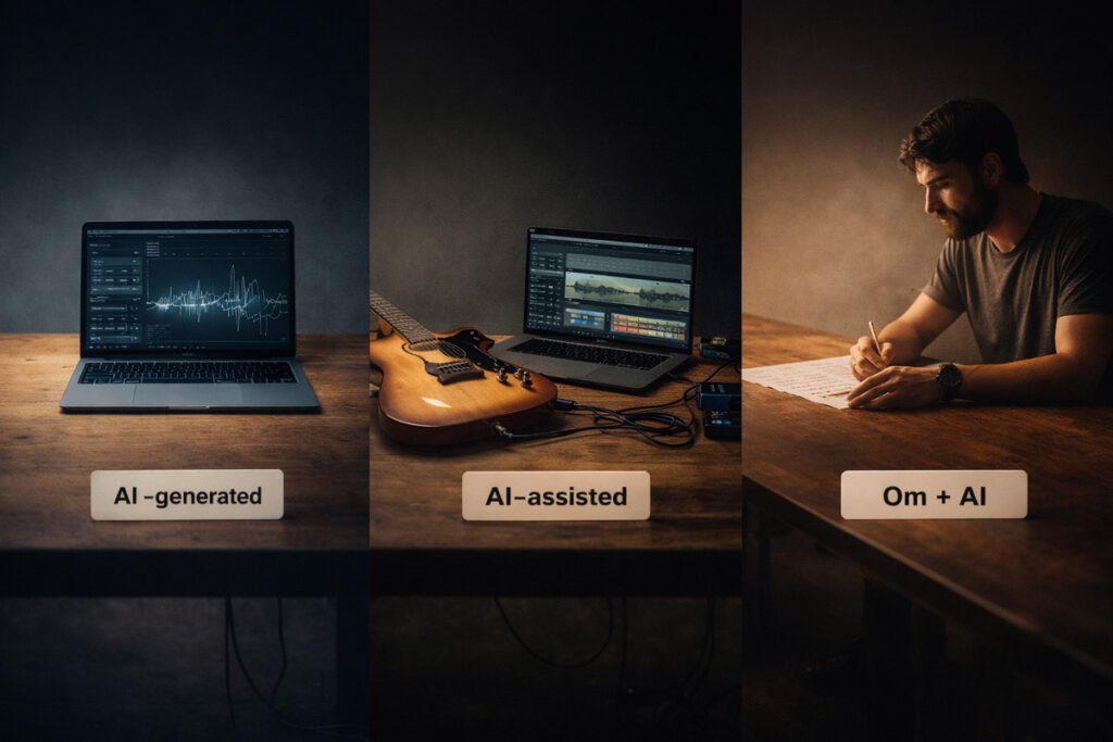 - AI-assisted înseamnă: omul a creat, AI-ul a ajutat (aranjament, sound design, idei, drafturi).